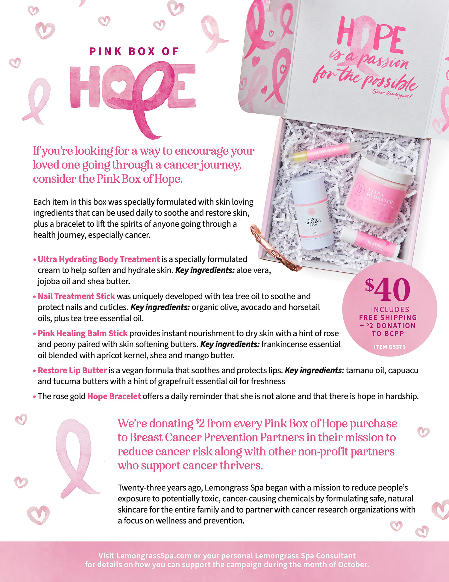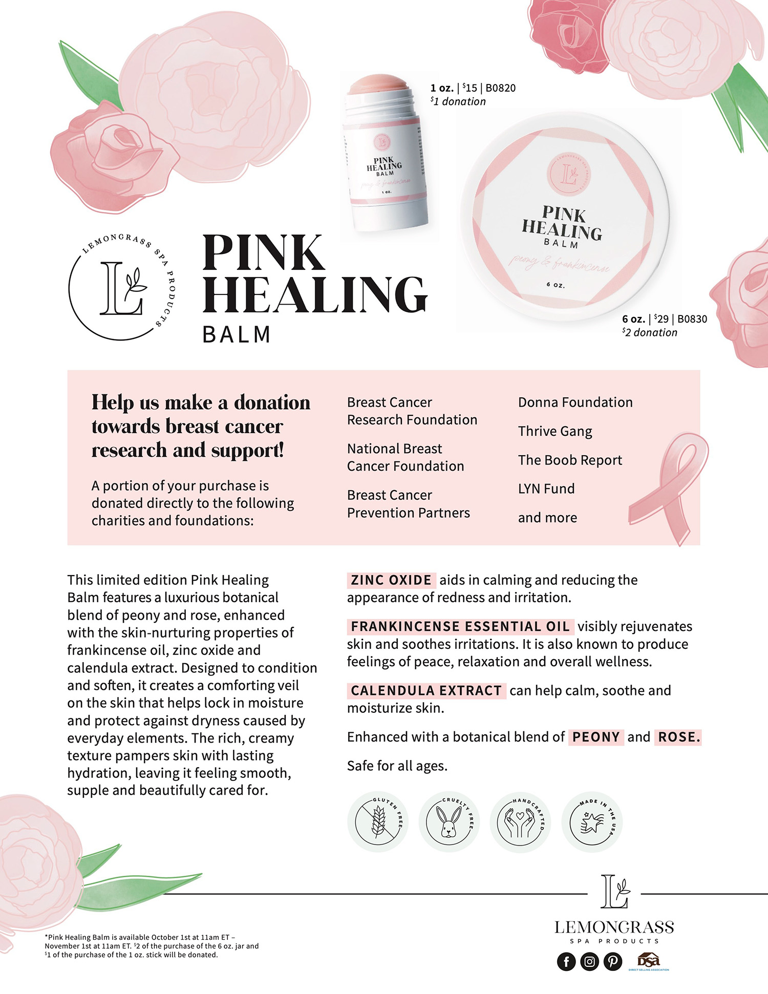 Scroll down for details on our Pink Healing Balm and Pink Box of Hope for our annual Pink Giving Back Campaign.
