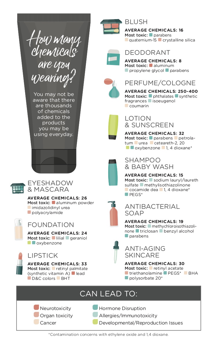 With the data published by the EWG, the Cosmetics Ingredient Review, the Breast Cancer Prevention Partners and the Campaign for Safe Cosmetics, we put together a handy guide the illustrates some of the toxic ingredients that might be lurking in your personal care products and cosmetics.